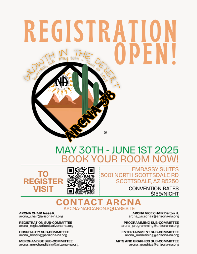 The Arizona Regional Convention of Narcotics Anonymous (ARCNA 38) is set for May 30th – June 1st, 2025, and we can’t wait to welcome you to Embassy Suites in Scottsdale, AZ for a weekend of recovery, fellowship, and fun!